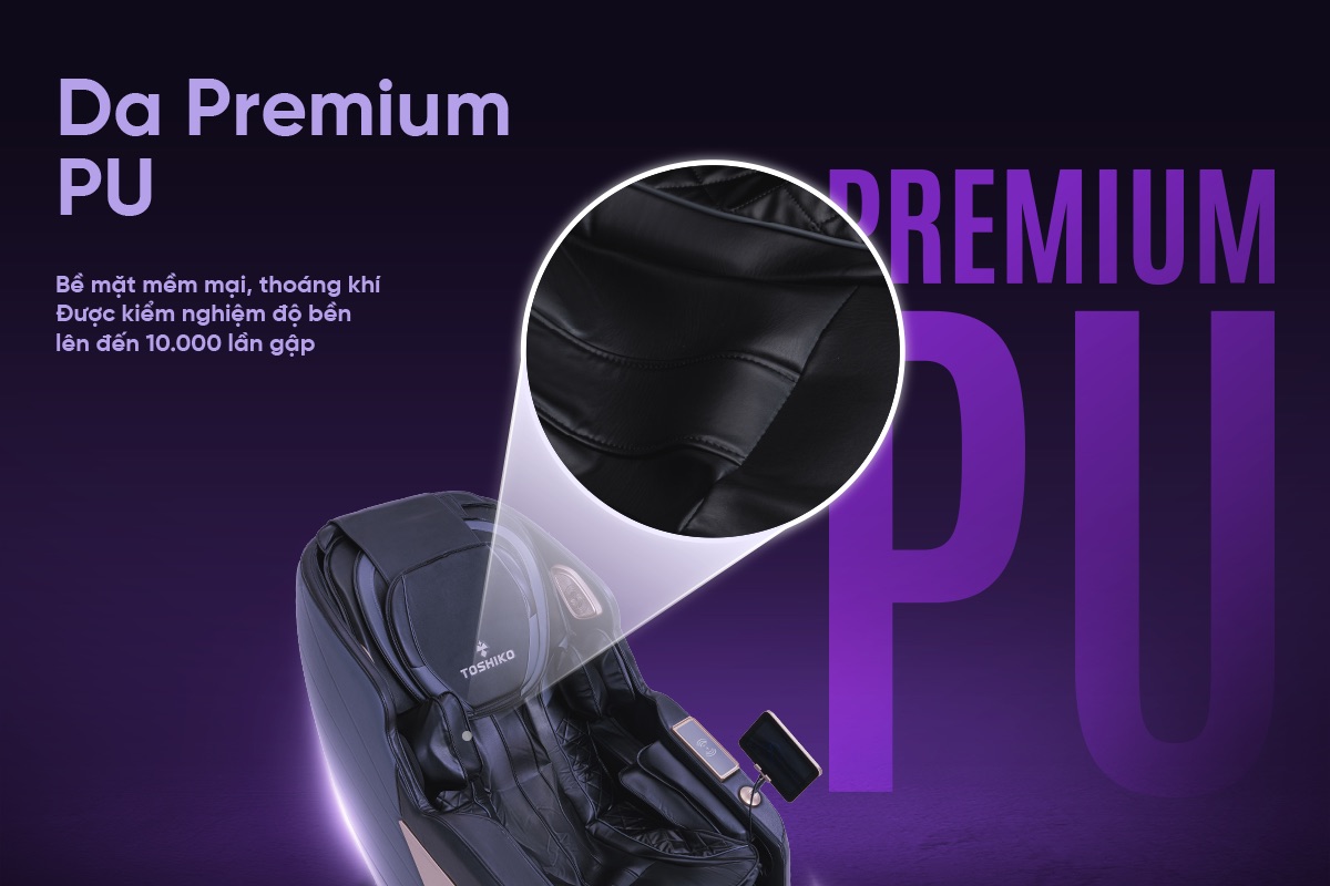 Toshiko T95 sử dụng chất liệu da Premium PU cao cấp, với cấu trúc bền chắc được kiểm nghiệm độ bền lên đến 10.000 lần gập, khả năng chống mài mòn, thủy phân và trầy xước hiệu quả. Bề mặt mềm mại, thoáng khí giúp giảm tích tụ nhiệt, mang lại cảm giác êm ái, dễ chịu suốt quá trình massage. Không chỉ bền vững theo năm tháng, da Premium PU của T95 còn rất dễ lau chùi, đảm bảo tính thẩm mỹ và vệ sinh cao, lý tưởng khi sử dụng tại các gia đình, văn phòng, spa, hay phòng khám,….
