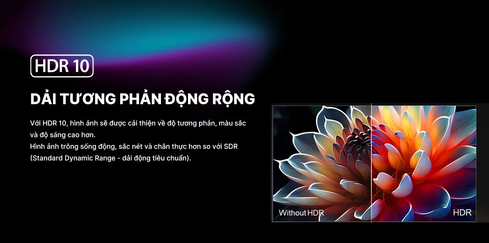 Nhờ hỗ trợ chuẩn HDR10, tivi tận dụng tốt dải sáng để hiển thị các cảnh sáng rõ ràng, giữ lại nhiều chi tiết hơn. Các vùng sáng và tối trong cùng khung hình được phân tách rõ rệt, đặc biệt khi xem phim hoặc nội dung HDR.