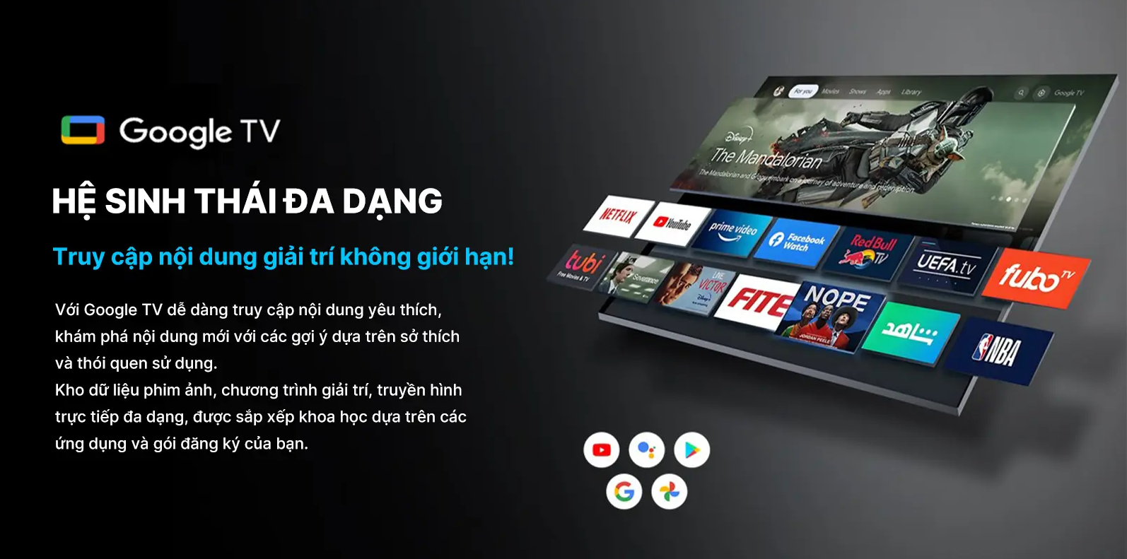 Đặc biệt, tính năng tìm kiếm giọng nói tiếng Việt thông qua Google Assistant được kích hoạt dễ dàng bằng cách nhấn nút micro trên remote, cho phép bạn điều khiển và tra cứu nội dung nhanh chóng, phản hồi gần như tức thì.