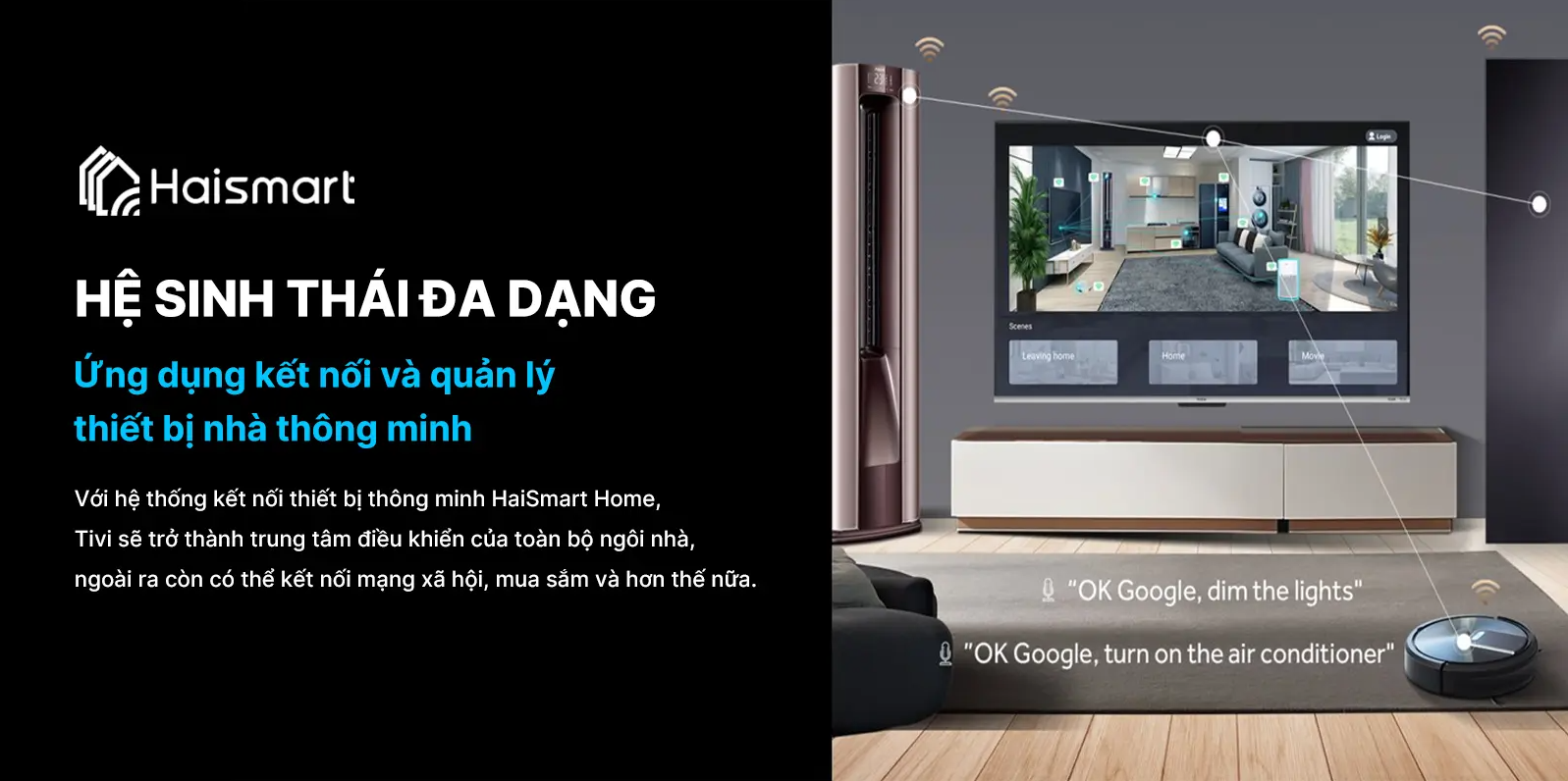 Không chỉ vậy bạn còn có thể điều khiển tivi dễ dàng bằng điện thoại thông qua ứng dụng HaiSmart, hỗ trợ chuyển kênh, tăng giảm âm lượng và tìm nội dung nhanh chóng.