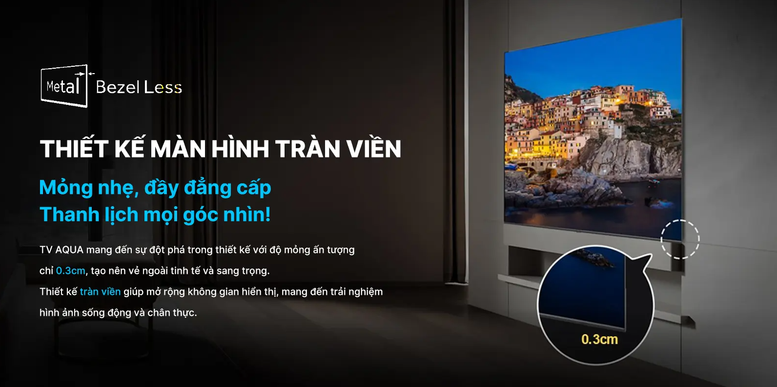 Ấn tượng đầu tiên về chiếc tivi này là viền kim loại mỏng khoảng 0.3 cm, tạo cảm giác hiện đại và thanh thoát. Thiết kế này còn giúp tăng tỷ lệ hiển thị, khiến nội dung trở nên nổi bật hơn khi xem.