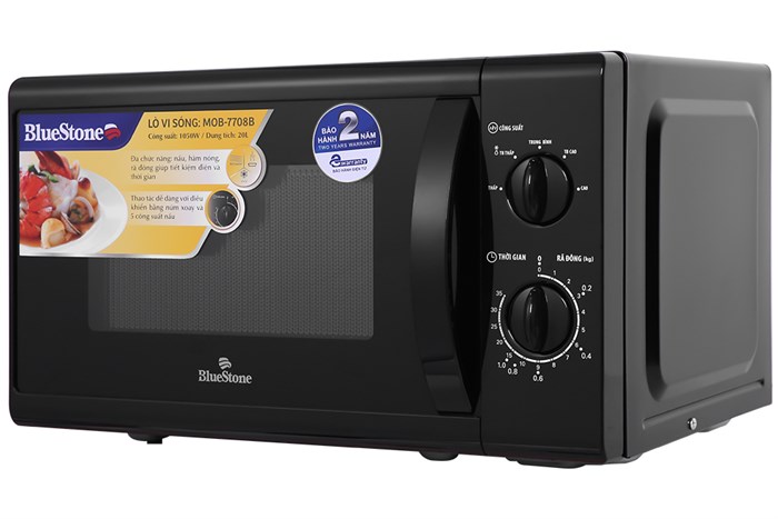 Lò vi sóng BlueStone MOB-7708B 20 lít của thương hiệu BlueStone – Singapore uy tín, công suất 1050W với 5 mức điều chỉnh làm chín thức ăn nhanh, điều khiển nút vặn tiếng Việt dễ hiểu, đa chức năng, kiểu dáng nhỏ gọn, phù hợp với gia đình ít thành viên.