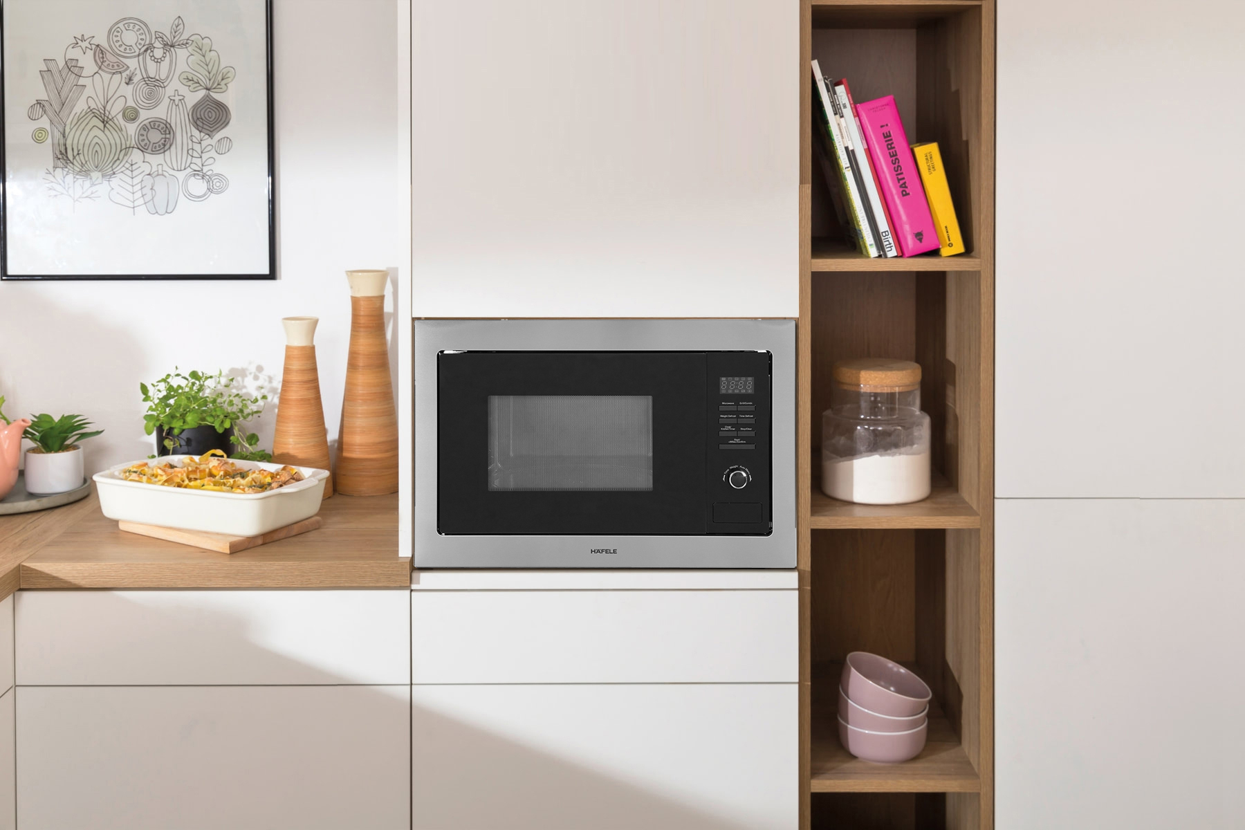 Lò vi sóng Hafele HM-B38A | 535.34.000 có khoang lò rộng rãi với dung tích 25 lít, giúp bạn chế biến được nhiều thực phẩm cùng lúc, đáp ứng nhu cầu sử dụng của gia đình có 3-5 thành viên. Không chỉ vậy, khoang lò còn được làm bằng chất liệu thép không gỉ sáng bóng, siêu bền, giúp đảm bảo an toàn về sức khỏe và dễ dàng vệ sinh. Giống như nhiều mẫu lò vi sóng khác, bên trong khoang lò cũng có đèn chiếu sáng để bạn quan sát thực phẩm trong quá trình nấu nướng mà không cần mở cửa lò.