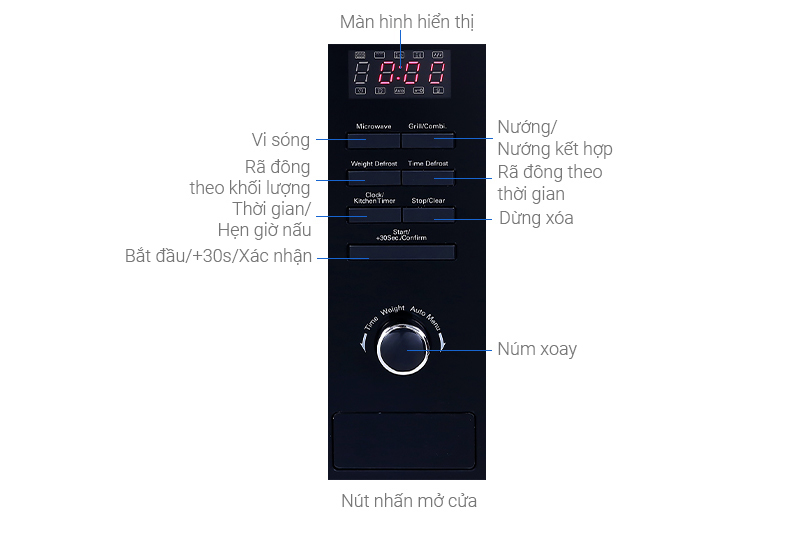 Rã đông theo trọng lượng (dEF1): Bạn chỉ cần xoay núm tham số để chọn khối lượng thực phẩm, lò vi sóng sẽ tự động điều chỉnh công suất và thời gian để rã đông thức ăn nhanh mà không làm mất đi dưỡng chất vốn có.