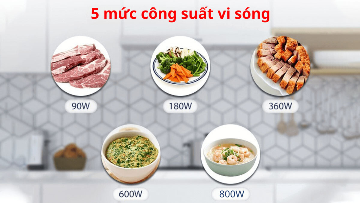 Lò được trang bị 5 mức công suất vi sóng. Bao gồm: 90W, 180W, 360W, 600W, 900W, giúp người dùng dễ dàng điều chỉnh mức độ phù hợp với từng loại thực phẩm. Bạn có thể hâm nóng, rã đông thực phẩm hoặc một cách nhanh chóng, tiện lợi, hỗ trợ tối đa cho người nội trợ.