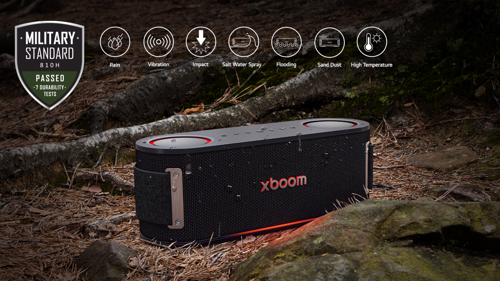 LG XBOOM Bounce còn đạt tiêu chuẩn quân đội MIL-STD-810H, vượt qua các bài kiểm tra về mưa, rung lắc, va đập và nhiệt độ cao. Độ bền ấn tượng này mang lại sự an tâm khi sử dụng ngoài trời hoặc trong những chuyến đi xa, kéo dài nhiều ngày. Sản phẩm luôn sẵn sàng đồng hành cùng người dùng trong nhiều chuyến phiêu lưu và hoạt động dã ngoại.