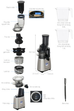 – Cốc đựng nước ép 0.8 lít và cốc đựng bã 1.2 lít đều làm từ nhựa AS trong suốt, có vạch đo dễ quan sát, đo lường lượng nước ép theo nhu cầu.