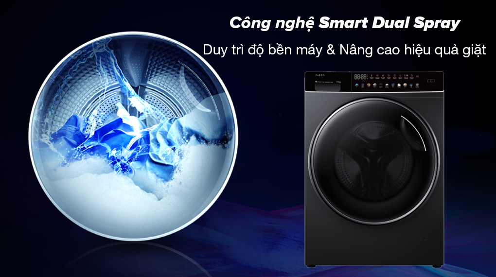 – Công nghệ Smart Dual Spray: Sử dụng các tia nước để loại bỏ các xơ vải và cặn bột giặt cùng với chất bẩn bám ở khu vực mặt trong cửa máy sau mỗi lần giặt giũ, nhờ đó góp phần nâng cao hiệu quả giặt sạch và kéo dài thời gian sử dụng sản phẩm tốt hơn.
