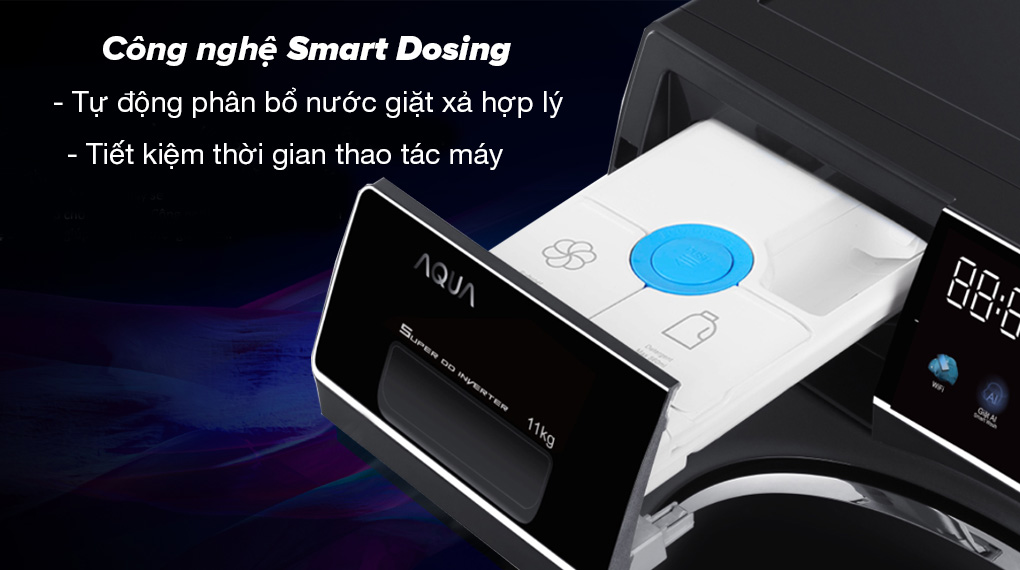 Công nghệ Smart Dosing: Chỉ cần đổ đầy nước giặt và nước xả vào ngăn chứa 1 lần, máy giặt Aqua Inverter 11 kg này sẽ tự động phân bổ chất giặt tẩy đó phù hợp với khối lượng quần áo trong nhiều lần giặt sau đó. Vì thế, tiết kiệm thời gian thao tác và bảo vệ da tay cho người dùng tốt hơn.