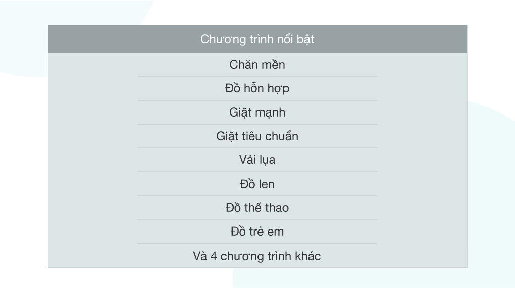 – 12 chương trình hoạt động được tích hợp sẵn phù hợp với nhiều nhu cầu giặt giũ khác nhau: Giặt tiêu chuẩn, giặt nhanh, giặt chăn mền, chống nhăn, đồ thể thao. Chương trình giặt “nhanh” thích hợp cho các loại quần áo mỏng, ít bẩn cần làm sạch nhanh để sử dụng.