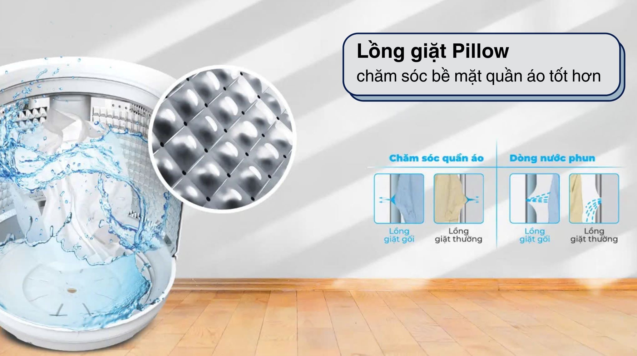 Lồng giặt Pillow với các gờ nổi dạng “gối” hỗ trợ cọ xát quần áo nhẹ nhàng hơn so với mặt phẳng, vừa làm sạch vừa hạn chế sờn sợi. Kết hợp với tốc độ quay vắt tối đa 700 vòng/phút, quần áo sau khi vắt thường ráo hơn, rút ngắn thời gian phơi trong điều kiện nắng gió phù hợp.