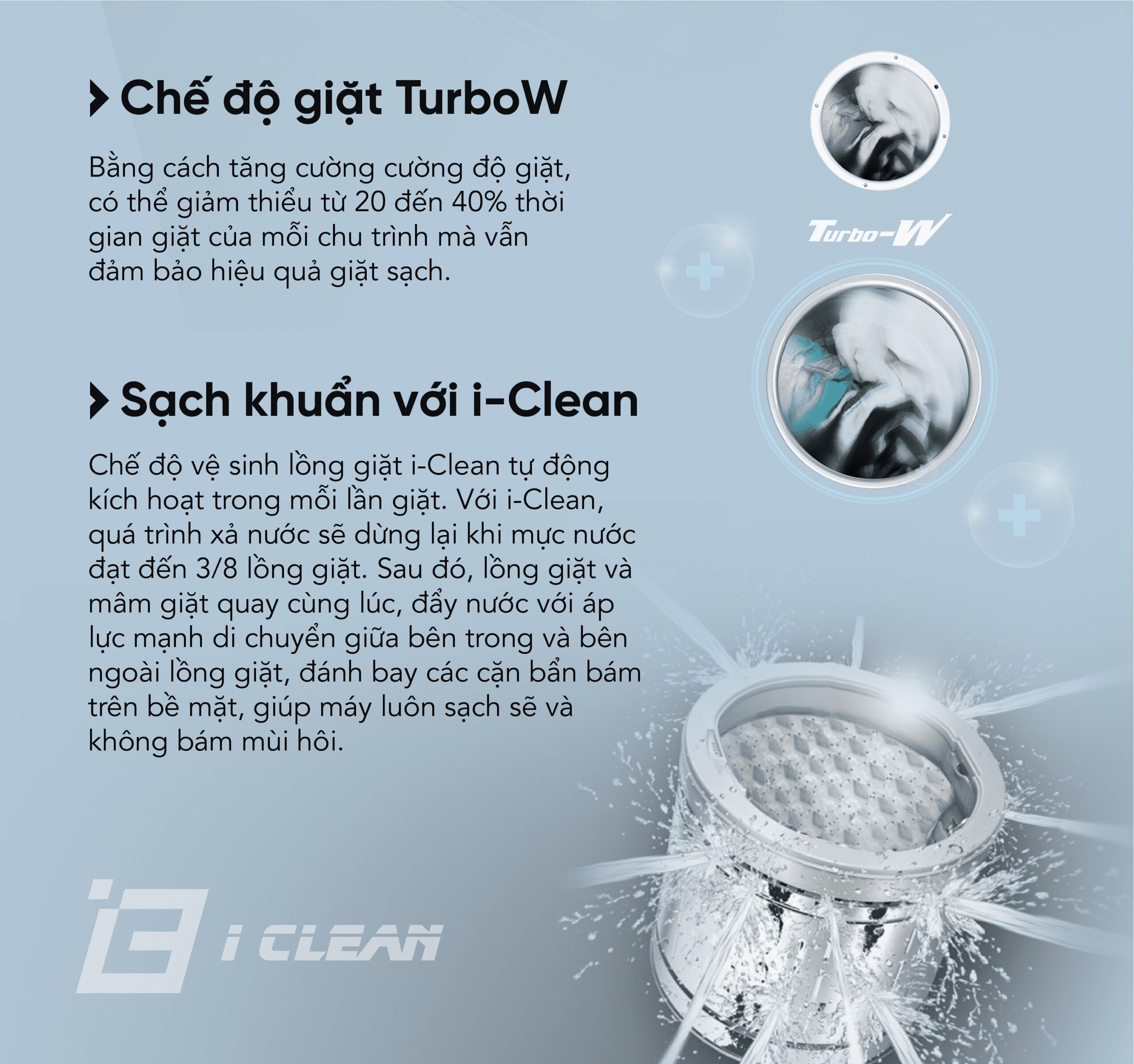 Công nghệ giặt nhanh Turbo W và tự động vệ sinh lồng giặt I-Clean