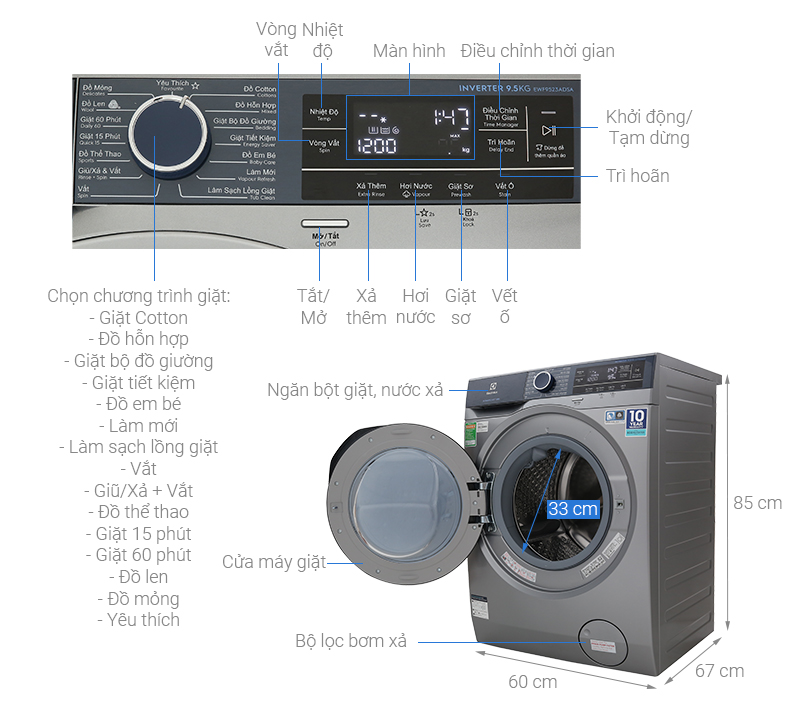 Máy giặt Electrolux Inverter 9.5 kg EWF9523ADSA mang sắc xám bắt mắt đi cùng thiết kế cửa trước hiện đại sẽ là một điểm nhấn tuyệt vời cho không gian nội thất. Hơn nữa, máy còn được trang bị bảng điều khiển cảm ứng song ngữ Anh – Việt, giúp bạn dễ dàng sử dụng hơn.