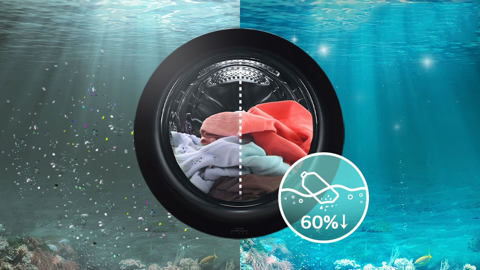 Máy giặt LG inverter FX1411N5S với lồng giặt lớn cùng các chuyển động xoay và nhào lộn làm giảm ma sát trong quá trình giặt từ đó giảm đến 60% lượng phát thải vi nhựa ra ngoài môi trường.