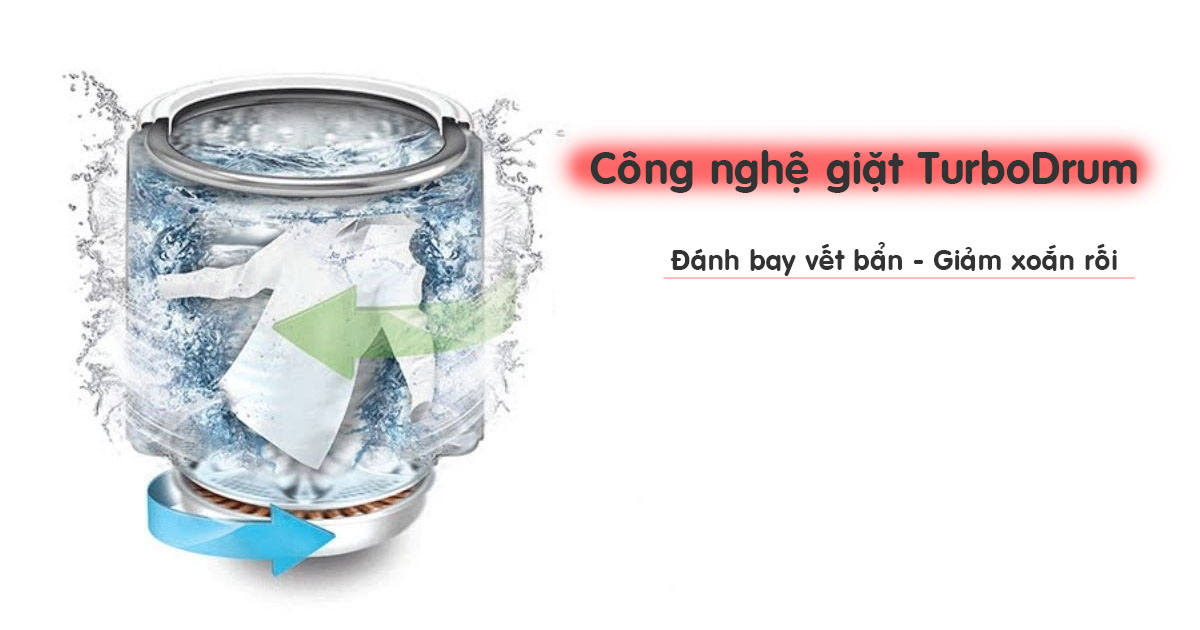 - Công nghệ giặt TurboDrum: Lồng giặt và mâm giặt được thiết kế thông minh có chuyển động tròn tạo luồng nước xoáy mạnh mẽ đánh bay mọi vết bẩn và giảm rối xoắn hiệu quả, mang đến trải nghiệm tuyệt vời cho người dùng.