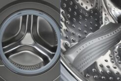 Lồng giặt bằng thép không gỉ kết hợp mặt kính cường lực tạo nên vẻ sang trọng và bền bỉ.