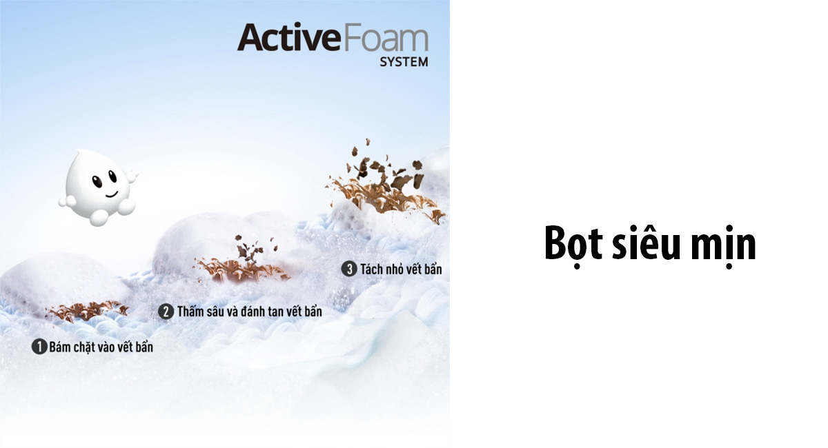 Hệ thống Active Foam trên máy giặt cửa trên Panasonic NA-F10S10BRV với khả năng hòa tan bột giặt thành hàng triệu bọt khí li ti, thẩm thấu nhanh vào từng sợi vải, để loại bỏ các vết bẩn cứng đầu, đảm bảo quần áo sẽ luôn được giặt sạch sẽ, hạn chế đóng cặn bột giặt bám trên quần áo.