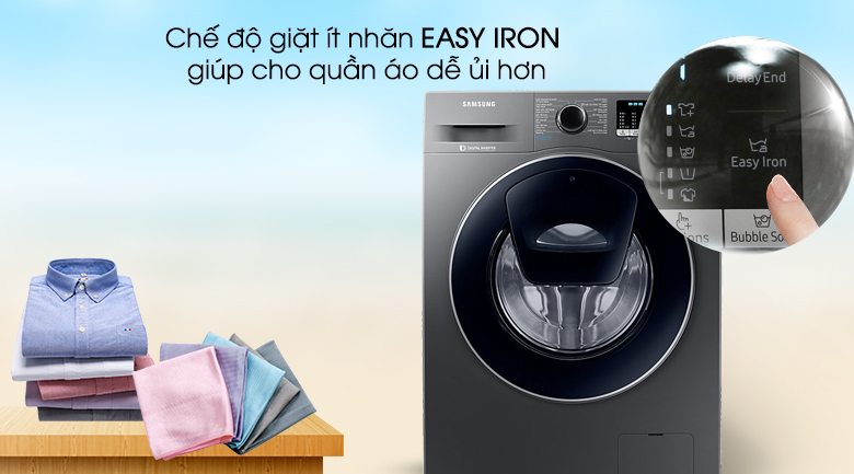 Sau quá trình giặt khá lâu là sự nghiệp ủi quần áo tiêu tốn thời gian nhiều không kém. Không để việc là ủi gây khó khăn trong việc chăm sóc gia đình của bạn, máy giặt cửa trên WW85K54E0UX/SV bằng chương trình giặt ít nhăn Easy Iron của mình sẽ giảm tốc độ quay của lồng giặt, hạ thời gian sấy khô đến mức tối đa để quần áo không còn bị xoắn rối quá nhiều hình thành các nếp nhăn. Từ đó cho việc là ủi đối với bạn trở nên dễ dàng hơn bao giờ hết.