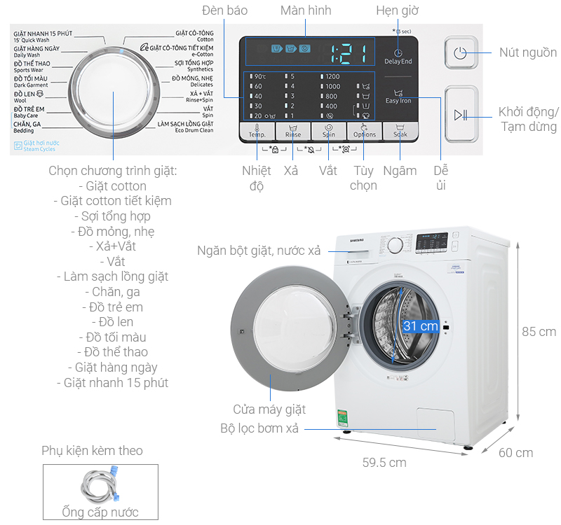 Máy giặt Samsung Inverter 8 kg WW80J52G0KW/SV mang sắc trắng cổ điển, thanh lịch phù hợp với mọi không gian lắp đặt. Bên cạnh đó, máy giặt được tích hợp bảng điều khiển song ngữ Anh-Việt, mang đến cho người tiêu dùng sự thuận tiện trong việc thao tác, sử dụng.
