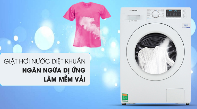 Việc quần áo bị bám vi khuẩn gây dị ứng cho làn da sẽ được loại bỏ với tính năng giặt hơi nước của chiếc máy giặt Samsung này. Với hơi nước ở nhiệt độ cao, máy giặt giúp tiêu diệt vi khuẩn và tác nhân gây mẩn ngứa bám trên quần áo, bảo vệ làn da nhạy cảm của bạn và người thân.