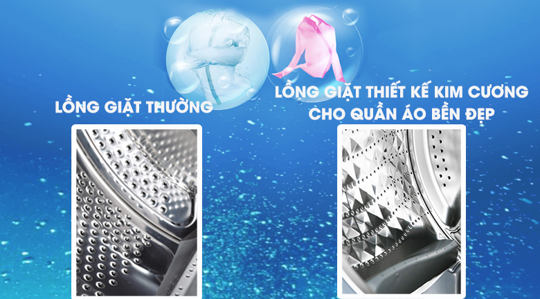 Lồng giặt thiết kế kim cương bằng thép không gỉ bảo vệ quần áo được bền đẹp với thời gian