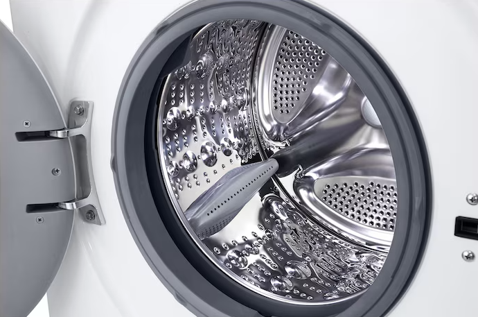Chất liệu cũng là điểm cộng khi máy giặt sấy LG sở hữu cửa kính cường lực chắc chắn, lồng giặt bằng thép không gỉ bền bỉ, hạn chế bám cặn và nấm mốc. Vỏ ngoài phủ lớp sơn tĩnh điện sang trọng, chống gỉ sét, giúp sản phẩm duy trì độ bền đẹp theo thời gian.