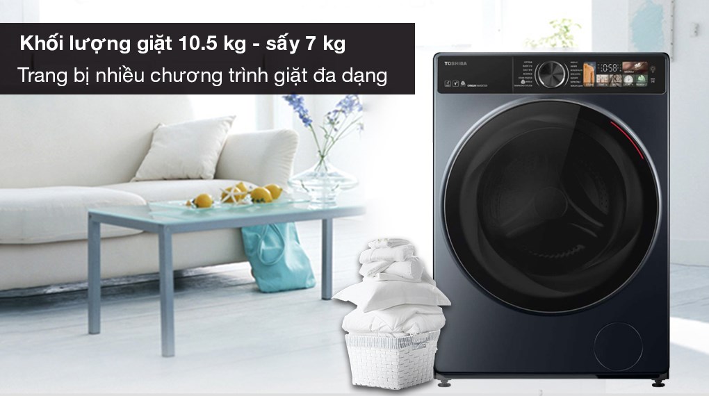 – Sản phẩm có thể giặt được khối lượng quần áo 10.5 kg hoặc sấy 7 kg, thích hợp sử dụng cho gia đình trên 7 người.
