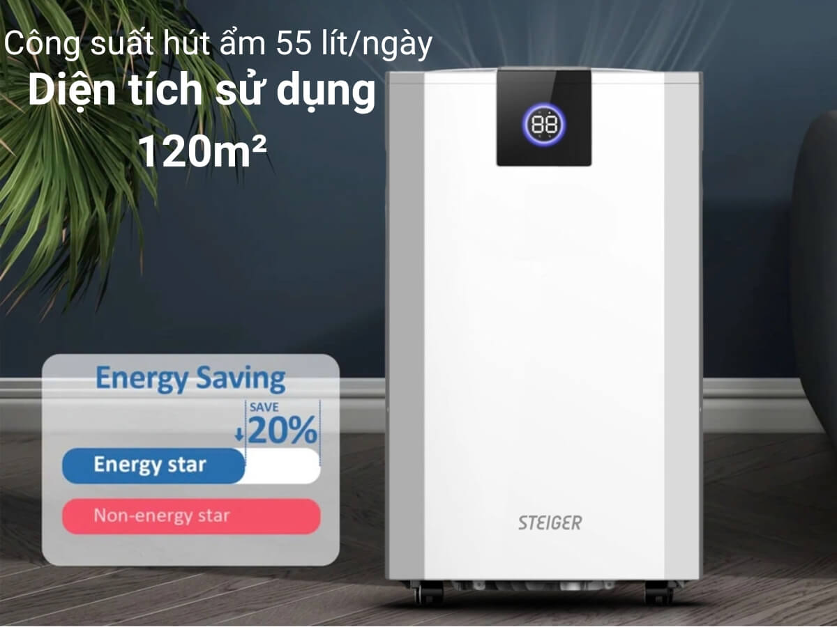 Công suất hút ẩm 55 lít/ngày, diện tích sử dụng 120m²