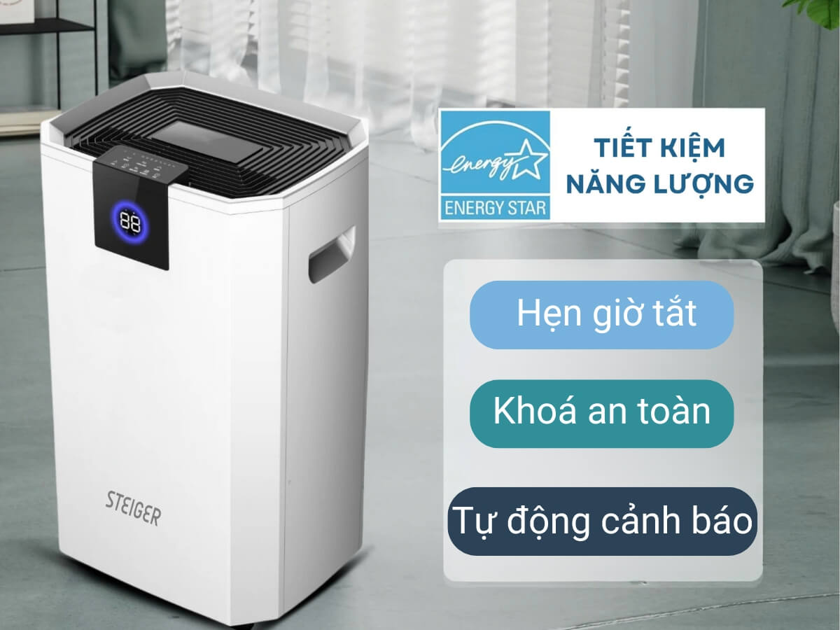Máy hút ẩm Steiger STG-855BW có chức năng hẹn giờ tắt máy 1-24h vô cùng tiện lợi. Theo đó, bạn có thể chủ động cài đặt thời gian để máy tự tắt vào thời điểm mong muốn để dễ dàng quản lý hoạt động của máy và tiết kiệm điện năng.