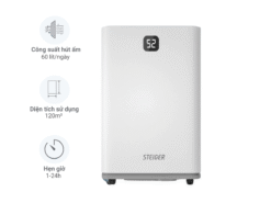 Máy hút ẩm Steiger STG-860DW sở hữu thiết kế sang trọng cùng hiệu suất hút ẩm vượt trội 60 lít/ngày, phạm vi làm việc lớn đến 120m², thích hợp với nhiều không gian như gia đình, văn phòng, phòng khám… Đặc biệt còn có chức năng hong khô quần áo, tăng trải nghiệm tiện dụng cho người dùng. Dung tích bình chứa 7.5 lít thoải mái sử dụng mà không cần đổ nước thường xuyên. Hệ thống điều khiển cảm ứng hiện đại, trực quan, dễ sử dụng. Có thể điều chỉnh 3 chế độ hút ẩm, 2 tốc độ quạt linh hoạt theo nhu cầu. Ngoài ra còn có nhiều tiện ích khác như: hẹn giờ, khoá trẻ em, điều khiển từ xa bằng điện thoại, tự động cảnh báo và ngừng hoạt động khi bình đầy…