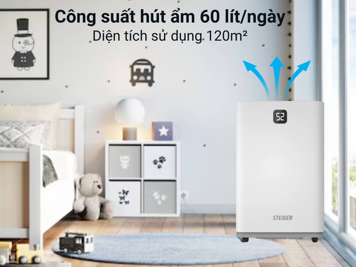 Công suất hút ẩm 60 lít/ngày, diện tích sử dụng 120m²
