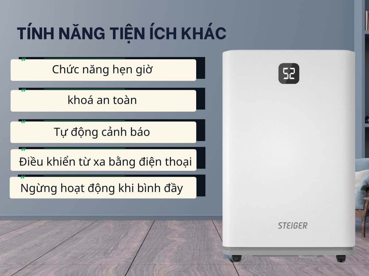 Máy hút ẩm Steiger STG-860DW còn tích hợp Wifi, cho phép kết nối với điện thoại thông minh của bạn thông qua ứng dụng, giúp để bạn dễ dàng điều khiển thiết bị trên điện thoại của mình, theo dõi hoạt động của máy và điều khiển máy từ xa một cách tiện lợi.