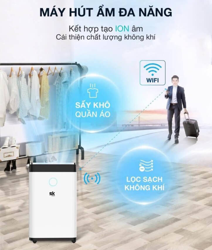 Máy hút ẩm SK không chỉ ghi điểm bởi thiết kế đẹp, công nghệ tiện lợi. Trên tất cả vẫn là những công năng hữu dụng mà sản phẩm mang lại. Tiêu biểu nhất là 3 công dụng sau: