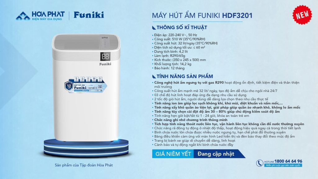 Máy hút ẩm Funiki HDF3201 của tập đoàn Hòa Phát là sản phẩm phù hợp cho phòng ≤ 60 m2 giúp giảm độ ẩm và cải thiện chất lượng không khí. Sản phẩm đặc biệt hữu ích trong mùa nồm ẩm làm giảm nguy cơ mốc đồ, hư hại thiết bị. Trong bối cảnh chất lượng không khí suy giảm, tính năng ion âm của máy hút ẩm Funiki giúp lọc sạch không khí, khử mùi, diệt khuẩn, nấm mốc và giảm các tác nhân gây dị ứng, được sử dụng cho các gia định có trẻ nhỏ hay bị viêm đường hô hấp, người già viêm mũi, dị ứng…