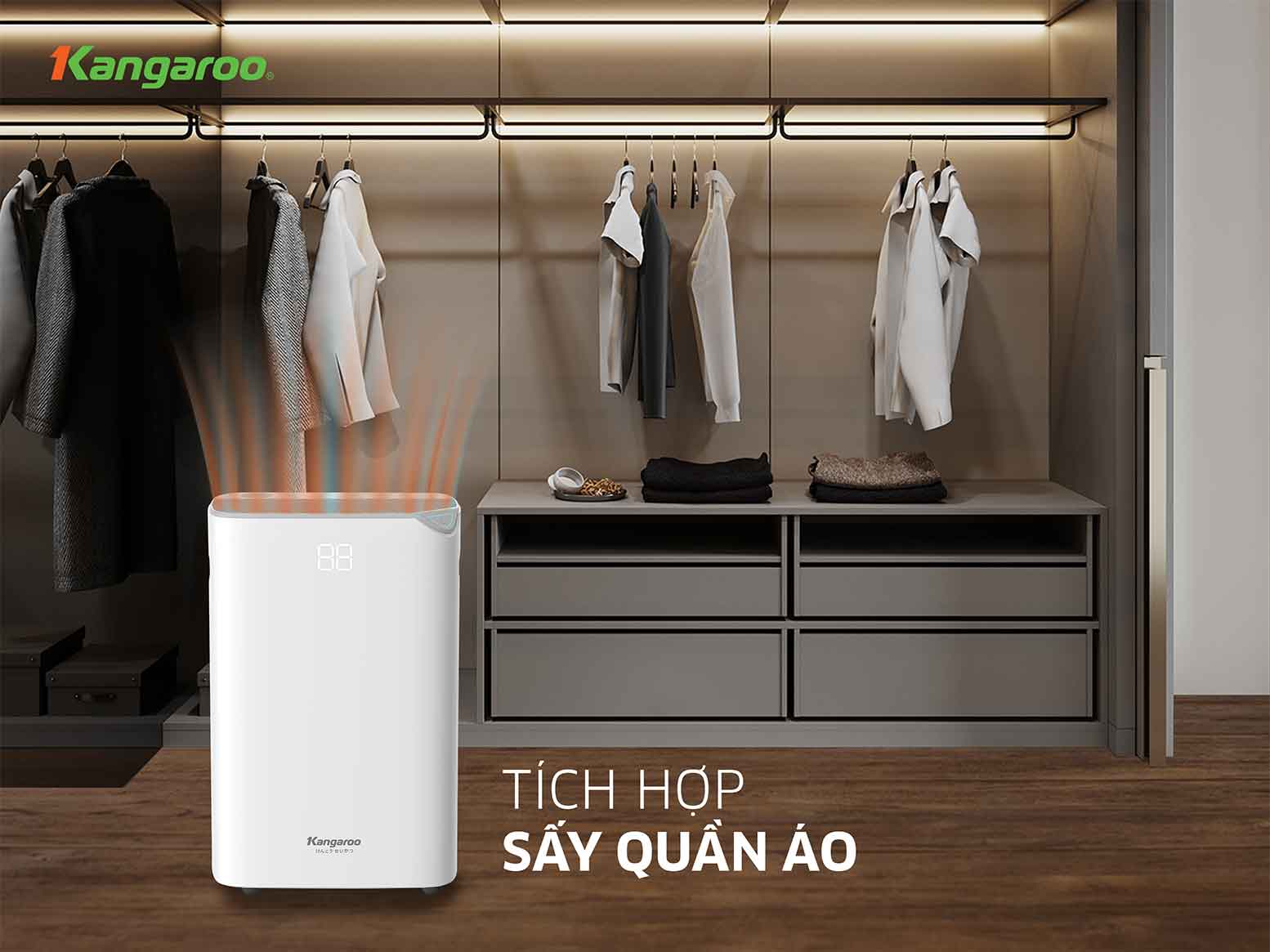 Máy hút ẩm Kangaroo KGDH20 tích hợp khả năng sấy khô quần áo. Với tốc độ quạt tối đa cùng khả năng hút ẩm sẽ hút sạch hơi nước trong quần áo, sấy khô quần áo nhanh chóng hơn.