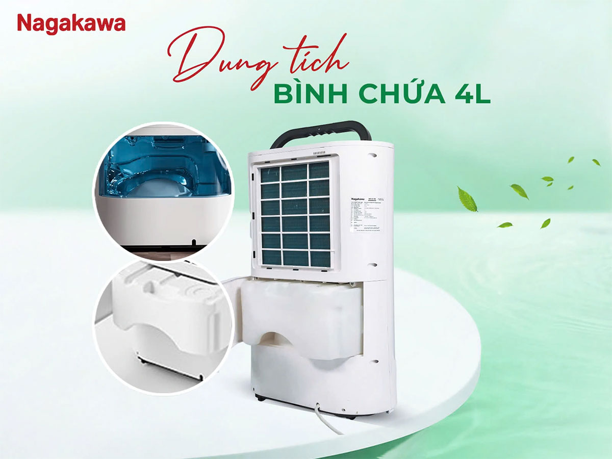 Nagakawa NAD8559 được trang bị bình chứa nước dung tích 4 lít cho phép máy hoạt động trong thời gian dài mà không cần đổ nước thường xuyên. Điều này giúp giảm bớt công việc cho người dùng, đặc biệt là trong những ngày thời tiết nồm ẩm kéo dài.
