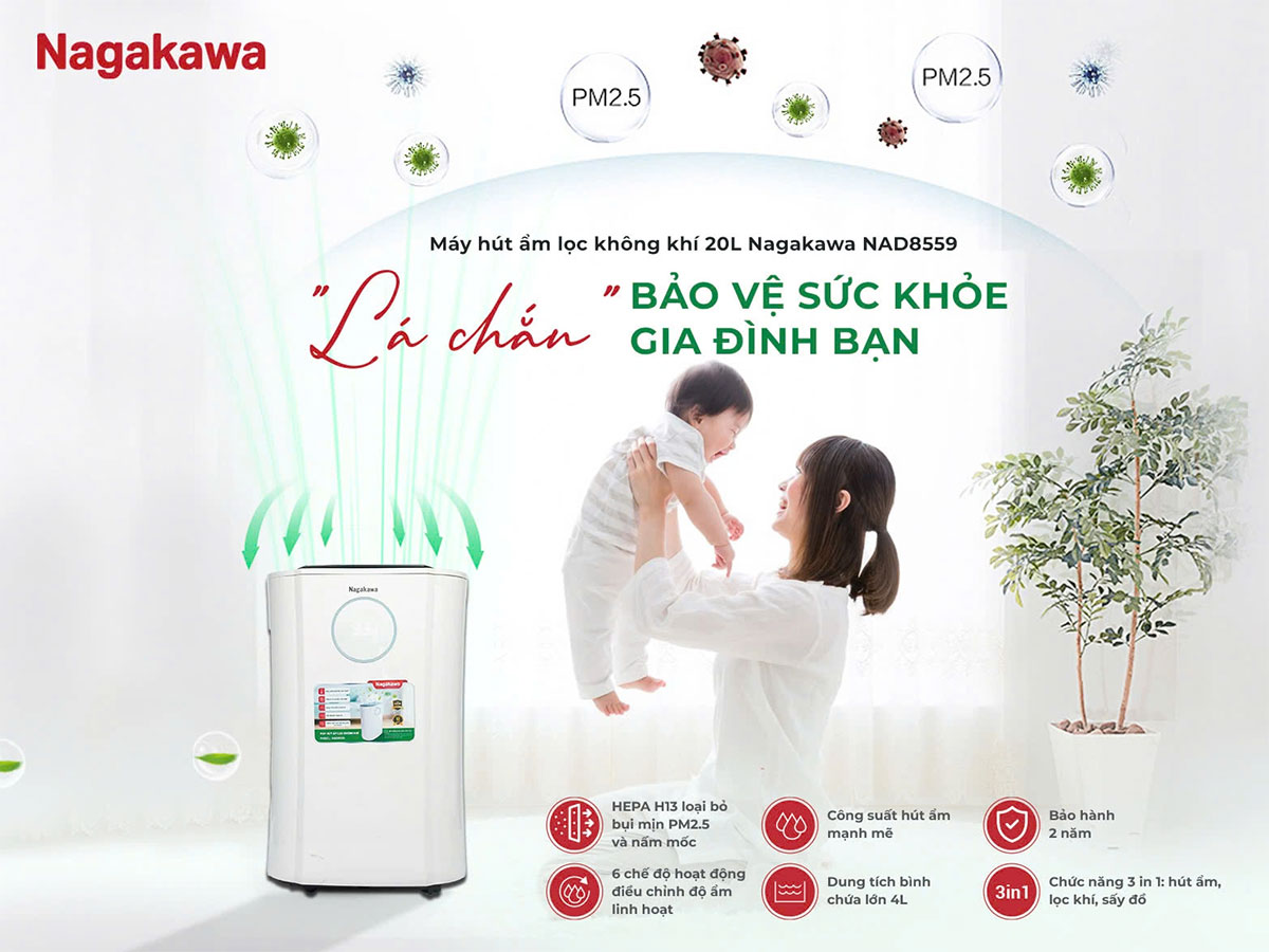 Máy hút ẩm lọc không khí Nagakawa NAD8559 là lựa chọn hoàn hảo giúp kiểm soát độ ẩm, bảo vệ sức khỏe gia đình và nâng cao chất lượng cuộc sống. Với thiết kế hiện đại, công suất mạnh mẽ, công nghệ lọc không khí tiên tiến và nhiều chế độ hoạt động linh hoạt, sản phẩm này mang lại không gian khô thoáng, trong lành, dễ chịu. Đặc biệt, Nagakawa NAD8559 còn giúp bảo vệ đồ đạc, quần áo khỏi ẩm mốc, tiết kiệm thời gian và công sức cho người dùng.