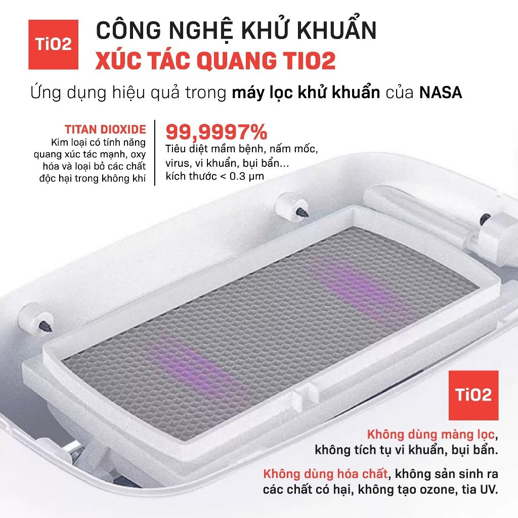 Với những ưu điểm vượt trội của công nghệ diệt khuẩn kép quang xúc tác TiO2 đã được ứng dụng hiệu quả trong máy lọc không khí khử khuẩn của NASA (cơ quan hàng không vũ trụ của Mỹ). Đặc biệt với khả năng diệt sạch virus, vi khuẩn đến 99,999%, sản phẩm rất hữu ích sử dụng trong gia đình vào thời tiết nồm ẩm.