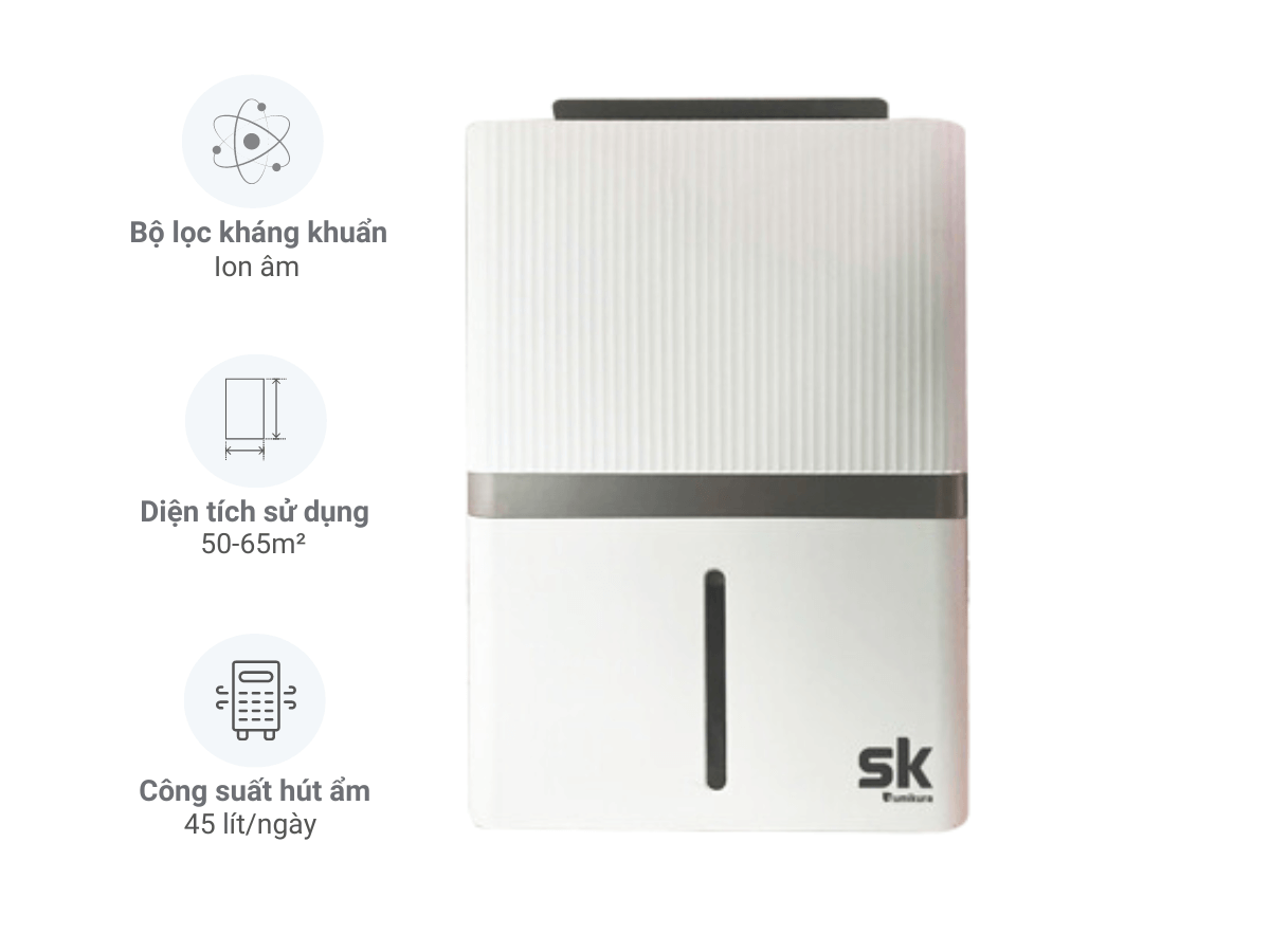 Máy Hút Ẩm SK Sumikura 45 Lít SK-460LA được thiết kế để hút ẩm hiệu quả cho nhiều không gian khác nhau, với diện tích sử dụng lên đến 50~65m2. Đây sẽ là giải pháp hoàn hảo để sử dụng trong gia đình như phòng khách, phòng ngủ, phòng làm việc… Thậm chí là văn phòng làm việc nhỏ, phòng khám… cũng có thể sử dụng máy hút ẩm này một cách hiệu quả.
