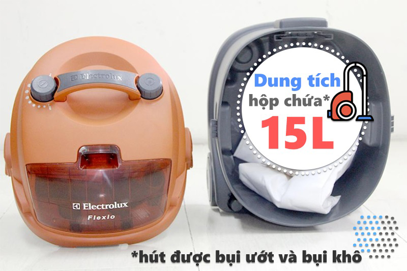 Máy hút bụi Electrolux có thiết kế hộc chứa bụi có dung tích lớn 15L, để người sử dụng có thể thoải mái hút bụi mà không lo đến việc xả bụi vì bị đầy.