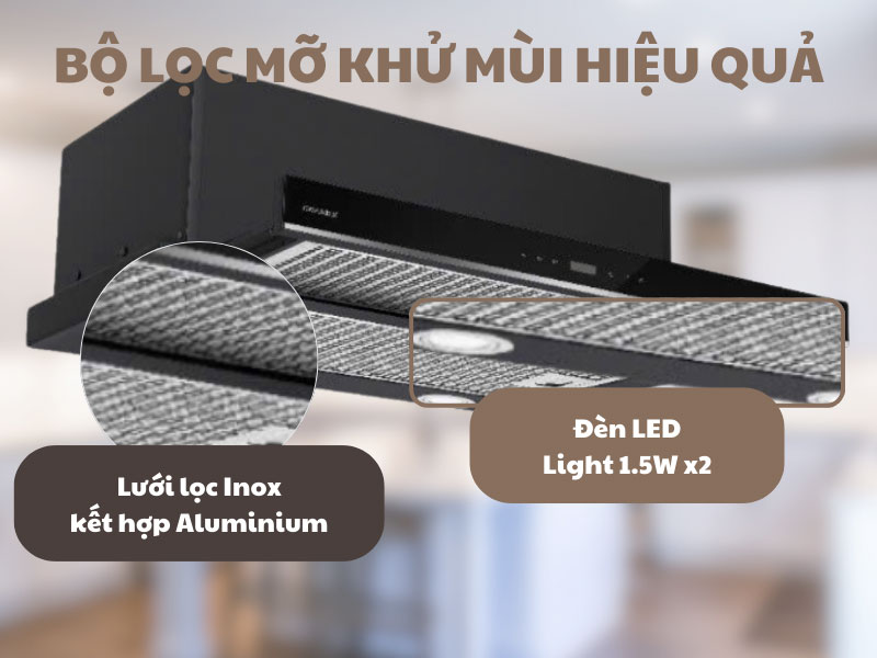Lưới lọc inox kết hợp Aluminium bền bỉ, dễ tháo lắp và vệ sinh giúp giữ lại dầu mỡ và bụi hiệu quả. Hệ thống lọc và khử mùi sử dụng than hoạt tính giúp loại bỏ mùi hôi, mang lại không khí trong lành cho không gian bếp.