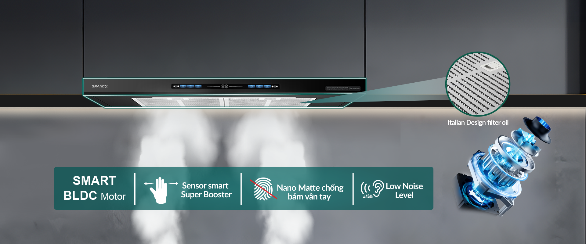 Máy hút mùi GrandX được tích hợp cảm biến Smart Function giúp phát hiện khói và mùi, từ đó tự động điều chỉnh công suất hút phù hợp. Nhờ đó, không khí luôn trong lành mà bạn không cần can thiệp thủ công quá nhiều.