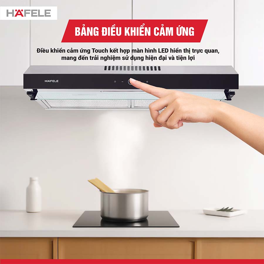 Máy hút mùi Hafele có bảng điều khiển cảm ứng Touch tinh tế, thay thế hoàn toàn cho các nút bấm cơ học truyền thống. Chỉ với một cái chạm nhẹ, bạn có thể lựa chọn chế độ hút, điều chỉnh tốc độ hoặc bật đèn chiếu sáng nhanh chóng và chính xác.