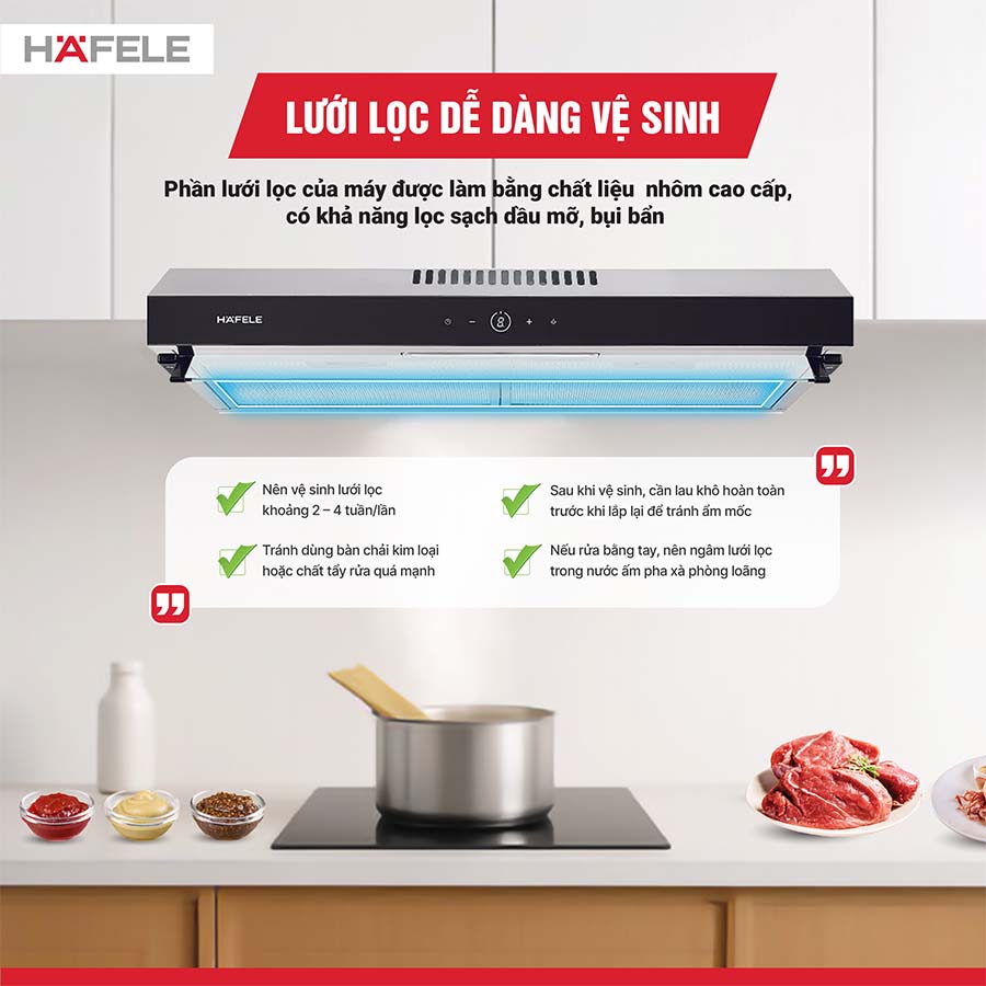 Vệ sinh định kỳ: nên vệ sinh lưới lọc 2–4 tuần/lần (tùy tần suất nấu nướng).