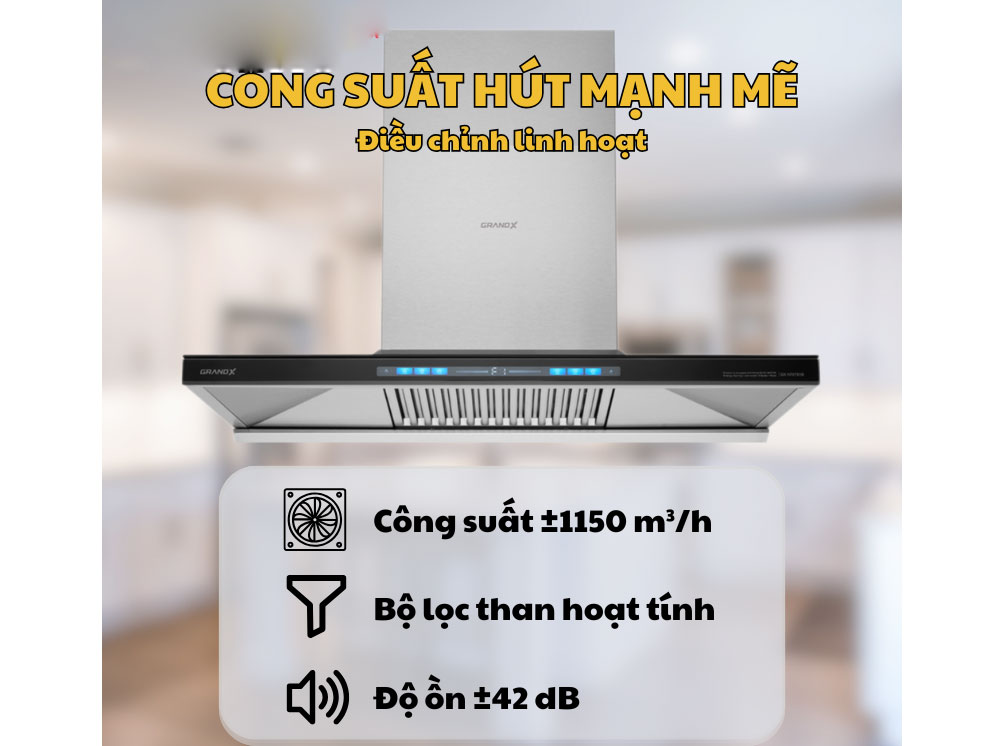 Máy hút mùi treo tường rộng 70cm GrandX GX H70T81B được trang bị động cơ Smart Inverter BLDC với công suấ 90W mạnh mẽ, với công suất hút lên đến ±1150m³/h, giúp loại bỏ khói, bụi, dầu mỡ và mùi hôi trong không gian bếp nấu có diện tích lên đến 30m² một cách nhanh chóng và hiệu quả.