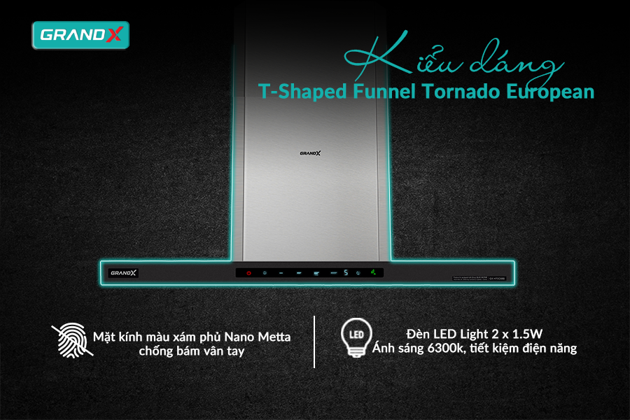 Hút mùi GX H90C68B sở hữu kiểu dáng T-Shaped Funnel Tornado European, thiết kế áp tường hiện đại kết hợp sự mạnh mẽ và thanh lịch, phù hợp với nhiều không gian bếp.