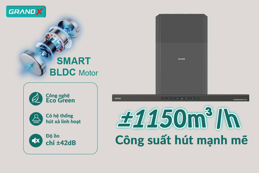 Máy hút mùi treo tường rộng 70cm GrandX GX H70C69G được trang bị động cơ Smart Inverter BLDC với công suấ 90W mạnh mẽ, với công suất hút lên đến ±1150m³/h, giúp loại bỏ khói, bụi, dầu mỡ và mùi hôi trong không gian bếp nấu có diện tích lên đến 30m² một cách nhanh chóng và hiệu quả.