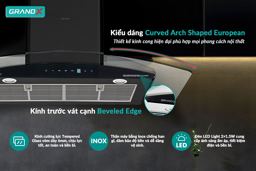 Kiểu dáng: Hút mùi GX H90C62B sở hữu thiết kế Curved Arch Shaped European, dạng kính cong hiện đại, hài hòa với mọi không gian bếp.
