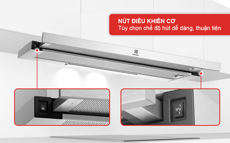 Điều chỉnh chế độ hút của máy hút mùi âm tủ Electrolux ECP9541X bằng các nút điều khiển phím cơ một cách dễ dàng. Hệ thống điều khiển cơ nhanh nhạy sẽ giúp bạn thay đổi linh hoạt các mức độ hoạt động khác nhau nhằm xử lý hoàn toàn mùi khó chịu.