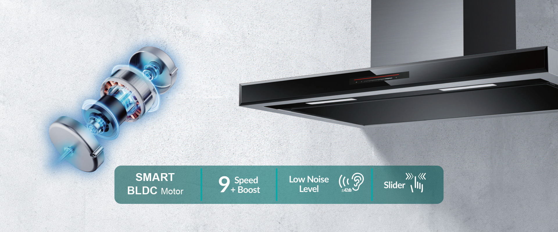 Hút mùi GX H90IL89 được trang bị bảng điều khiển Slider và Sensor Touch Smart với 9 tốc độ, cho phép người dùng tùy chỉnh linh hoạt theo nhu cầu nấu nướng.